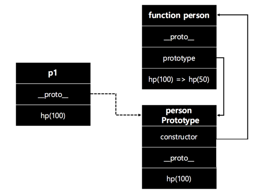 var person = function() {} person.hp = function() { console.log("100"); } person.prototype.hp = function() { console.log("50"); } var p1 = new person(); p1.hp() // 50이것이 가능한 이유는 p1의 원형이 되는 Prototype Object 에 직접 접근했기 때문이다.